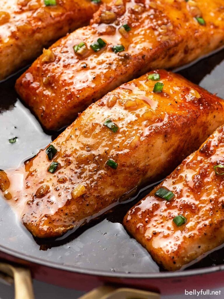 The glaze uses honey, garlic, soy sauce, and a touch of acid like lemon or lime juice. You coat the salmon before cooking and let it caramelize in the oven or on the stovetop.