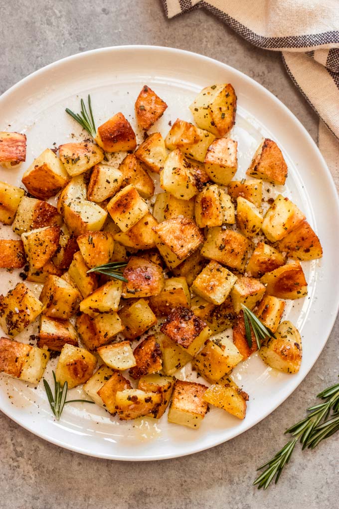 Garlic and rosemary roasted potatoes deliver a crispy outside with a tender inside. You can make this side dish with just a few basic items: potatoes, oil or butter, garlic, and fresh rosemary.
