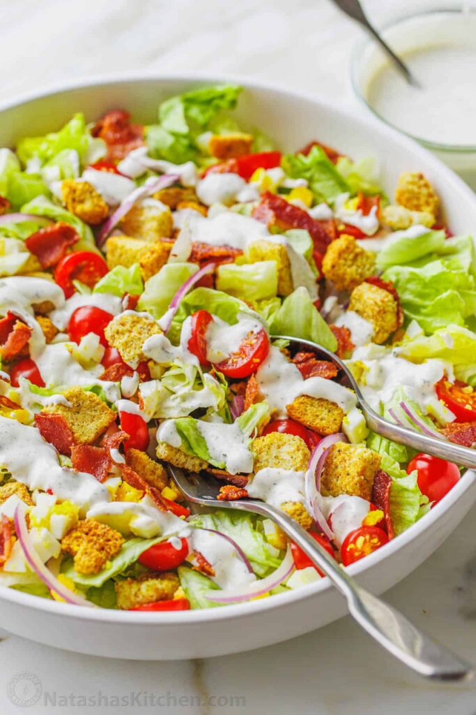 A garden salad brings bright, crisp flavors that balance the smoky richness of grilled chicken. You can use romaine lettuce, cherry tomatoes, cucumbers, and shredded carrots as your base.