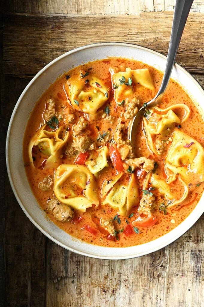 The tortellini adds a satisfying texture while the sausage provides protein. Serve it with crusty bread and grated Parmesan cheese on top.