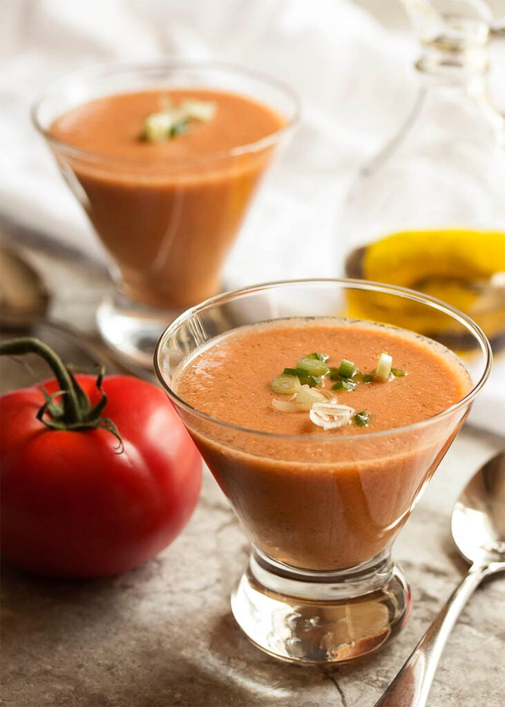 Gazpacho is a cold Spanish soup that works great on hot summer days. You don’t need to cook anything, which makes it easy to prepare.