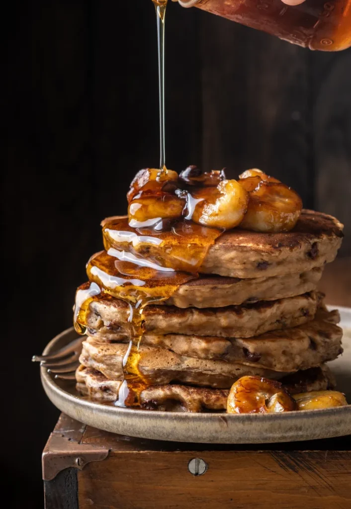 Caramelized banana pancakes combine fluffy pancakes with sweet, golden bananas cooked in butter and sugar. Add mashed bananas directly to the batter for extra banana flavor throughout.