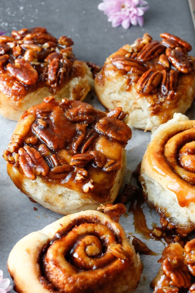 Maple pecan sticky buns combine soft dough with a rich maple glaze and crunchy pecans. Bake the buns with the topping on the bottom, then flip them over so the sticky maple pecan layer becomes the top.