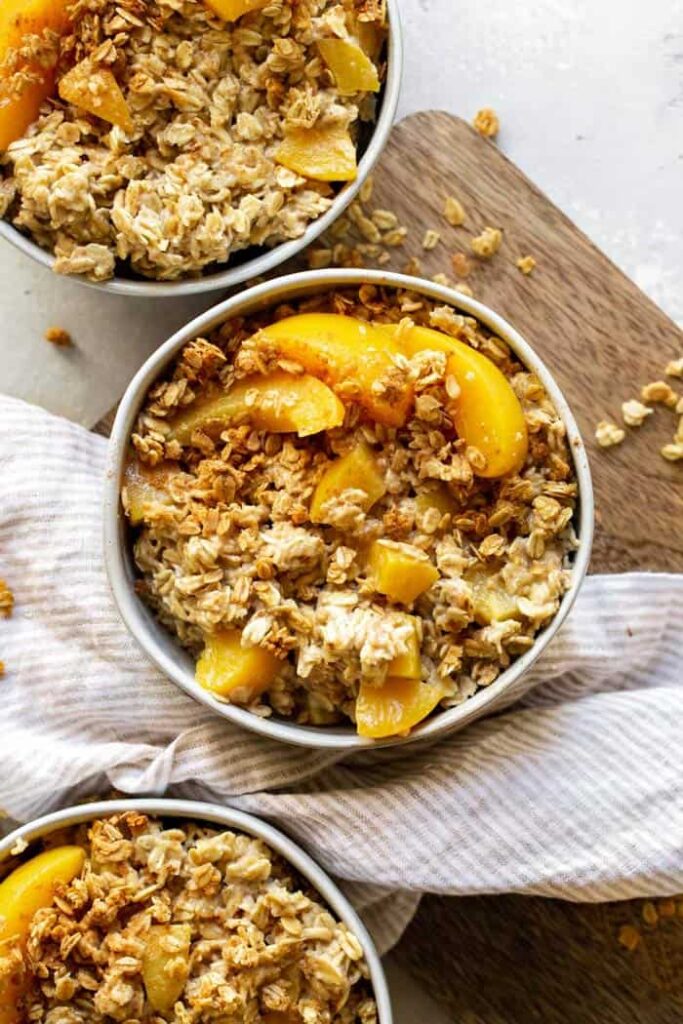 Combine rolled oats with brown sugar, cinnamon, and sweet peaches. You get a filling breakfast that tastes like a treat but provides good nutrition.