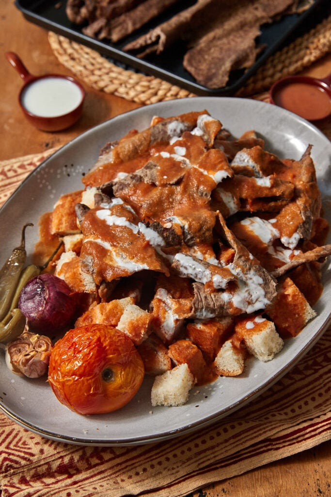 The dish combines thin slices of meat with a rich tomato sauce served over toasted pita bread. Melted butter and creamy yogurt go on top.