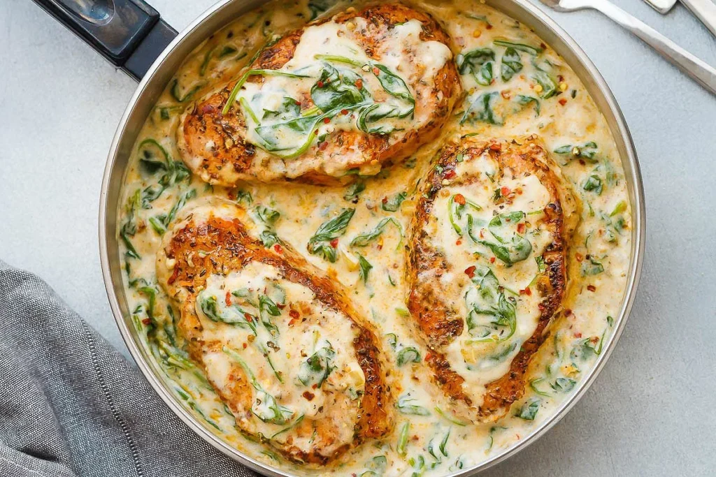 The filling includes chicken, spinach, and sun-dried tomatoes in a rich cream sauce.