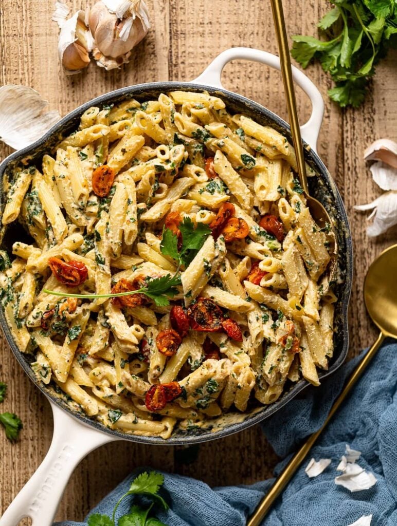 The creamy base comes from cashews or coconut cream instead of dairy. Sauté garlic and sun-dried tomatoes first, then add spinach and your choice of cream.