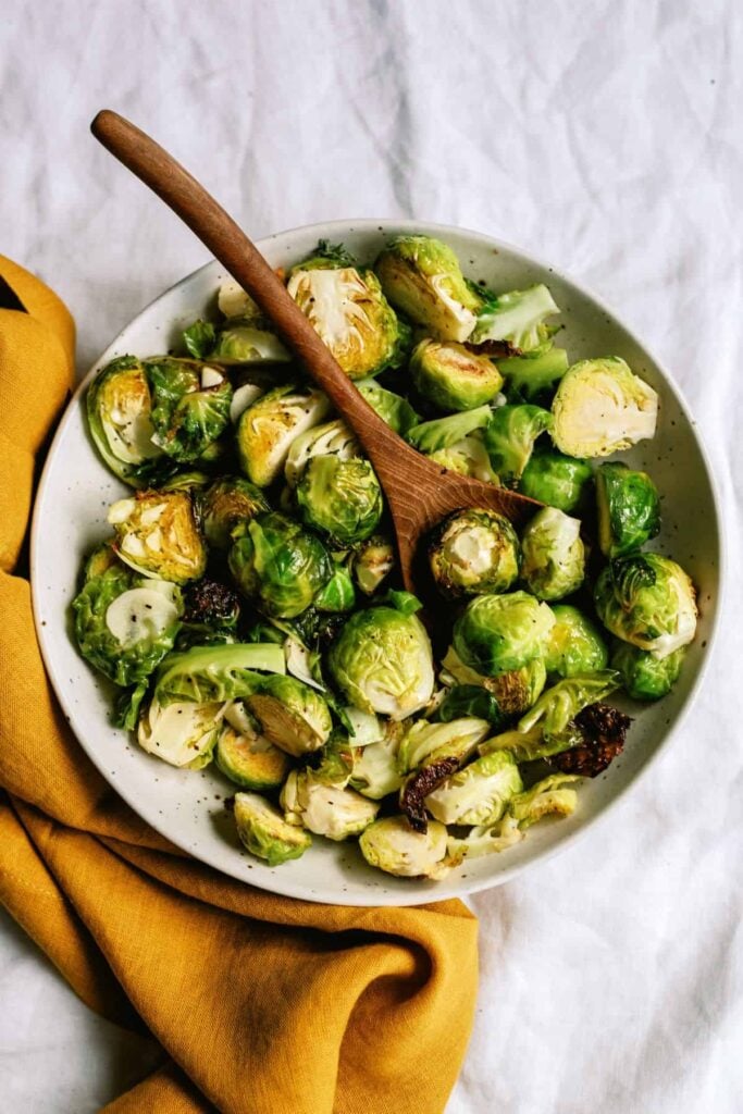 Shake the pan halfway through cooking for even browning. The sprouts turn golden brown and crispy on the edges when done.