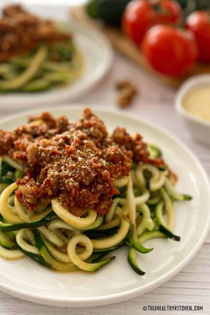 Zucchini Noodle Bolognese fills you up with protein-rich meat sauce.