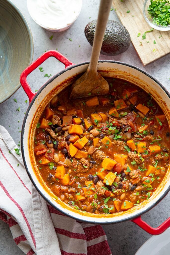 This hearty chili swaps traditional beans for tender sweet potato chunks. You’ll get a naturally sweet flavor that balances perfectly with savory spices and ground or shredded chicken.