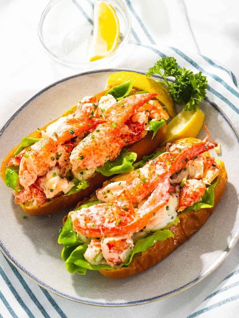 Maine-style lobster rolls offer sweet lobster meat served cold with mayo on a toasted bun. They’re perfect for summer meals.