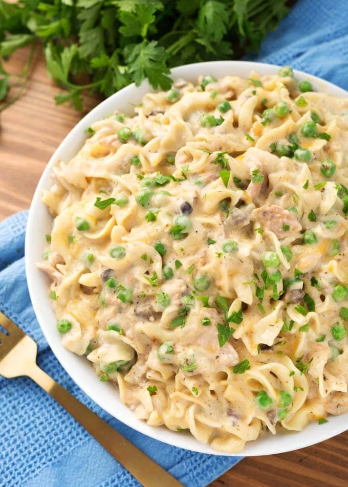 Make this classic comfort dish in just 30 minutes. Mix cooked egg noodles with canned tuna and frozen peas.
