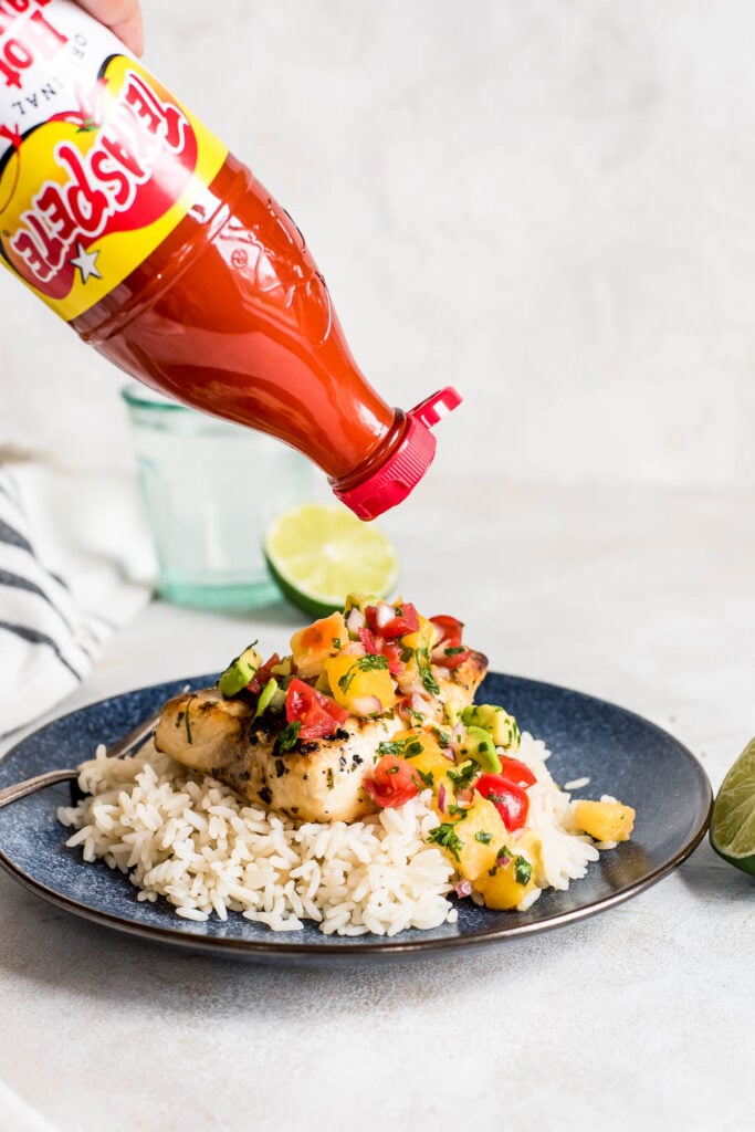 Make the salsa by mixing diced pineapple, red bell pepper, red onion, cilantro, and lime juice. The sweet pineapple balances the fish’s rich flavor perfectly.