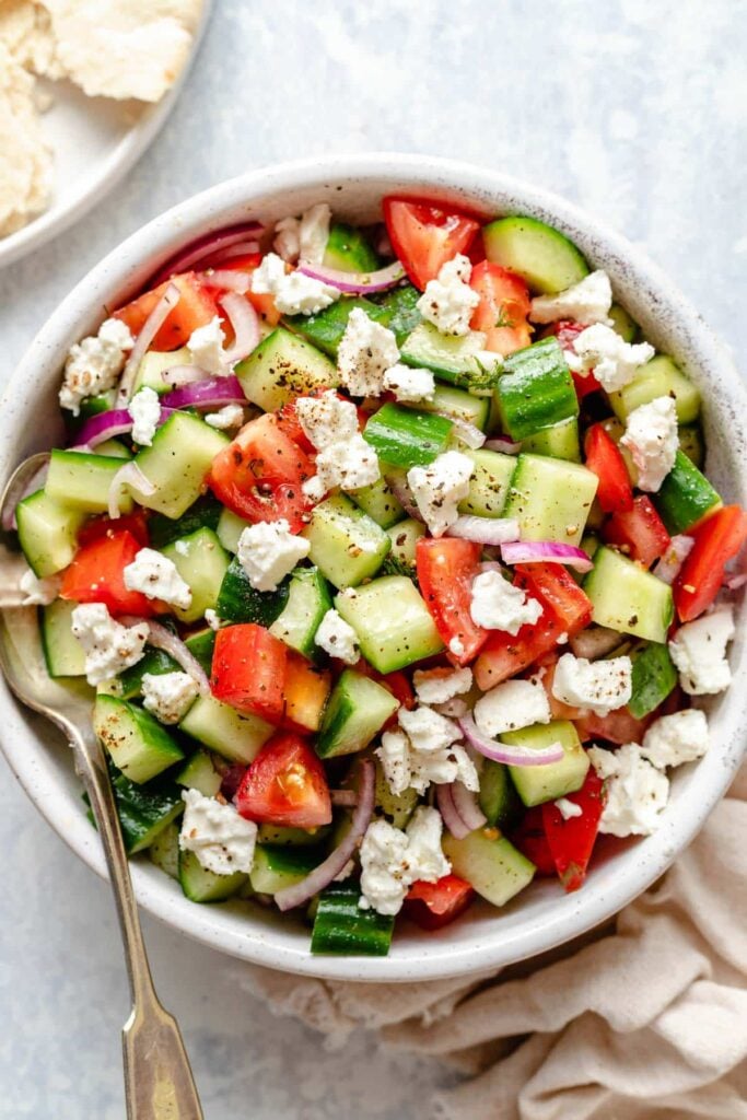 You can make it simple with just cucumbers, tomatoes, and onions. Add a basic vinegar dressing for tang that complements the sweet BBQ sauce on your ribs.