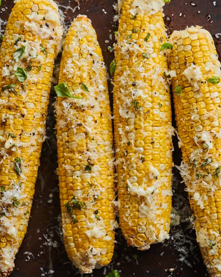 Garlic parmesan roasted corn on the cob gives you sweet corn flavor with savory garlic notes. The roasting brings out natural sugars that work well with barbecue sauce.